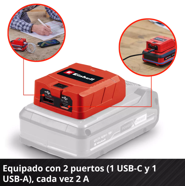 Con el adaptador de batería USB TC-CP 18 Li USB A/C-Solo de Einhell, siempre tendrás una fuente de alimentación externa para tus dispositivos móviles.