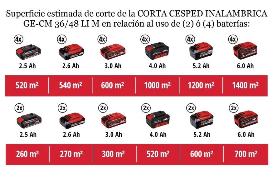 El cortacésped no incluye batería ni cargador, que están disponibles por separado. Se recomienda utilizar baterías de 2,5 Ah o de mayor capacidad para obtener los mejores resultados.