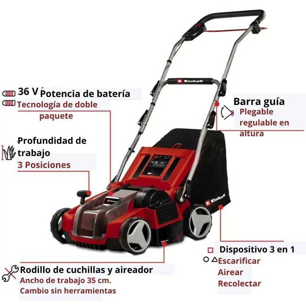 El escarificador inalámbrico GE-SA 36/35 Li – Solo de Einhell garantiza un verde impecable en el jardín de su casa. Gracias a su tecnología Power X-Change, trabaja libre de cables. La tecnología TWIN-PACK utiliza la energía de dos baterías PXC de 18V. El dispositivo funciona con el motor sin escobillas Einhell PurePOWER, sin escobillas, que ofrece más potencia y mayor tiempo de funcionamiento que los motores tradicionales. El dispositivo combinado 3 en 1 permite escarificar, airear y cortar. Equipada con un rodillo cortador de alta precisión que cuenta con 16 cuchillas de acero inoxidable, esta herramienta penetra eficazmente en el césped para revitalizarlo y fomentar un crecimiento saludable. Su rodillo ventilador, con 26 garras y montado sobre rodamientos de bolas, garantiza un rendimiento excepcional y uniforme. El ajuste central de la profundidad de trabajo en 3 niveles, junto con una posición de transporte adicional, te permite trabajar con total comodidad y adaptabilidad. Además, el manillar plegable y ajustable en altura, con una palanca de cierre rápido y posición de aparcamiento, facilita un manejo sin esfuerzo. La asa de transporte integrada hace que mover la escarificadora sea sencillo.