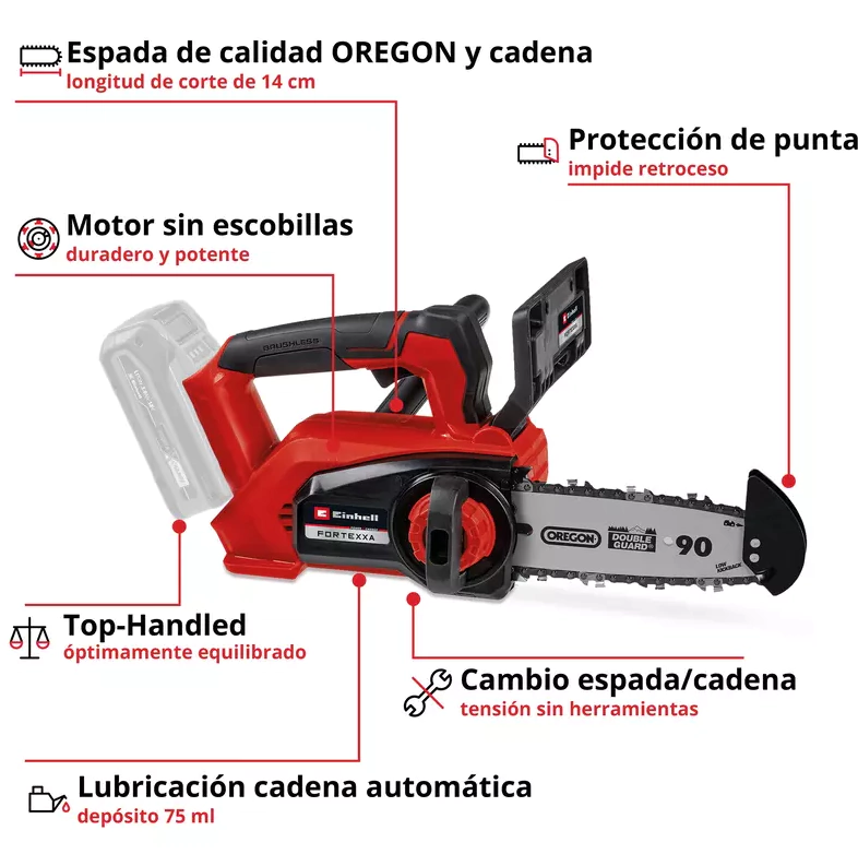 La motosierra a una mano con batería FORTEXXA 18/20 de Einhell es el aliado perfecto para quienes buscan potencia y comodidad en el cuidado de árboles. Con su motor sin escobillas, ofrece mayor durabilidad y eficiencia en comparación con los motores convencionales, permitiéndote realizar cortes más precisos y duraderos.
